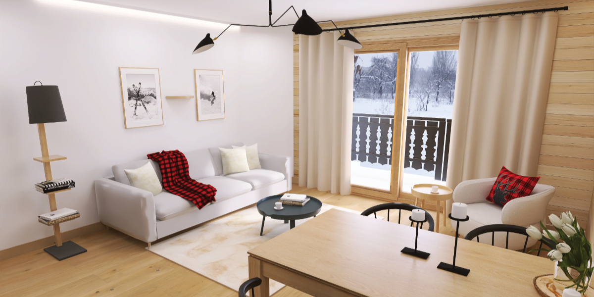 Dans la pièce de vie, le bois clair habille les murs et réchauffe l’atmosphère, tandis que les touches de rouge vichy et le luminaire graphique en métal noir viennent apporter du caractère et du contraste. Une ambiance chaleureuse et vivante, pensée pour les soirées en famille au coin du feu.