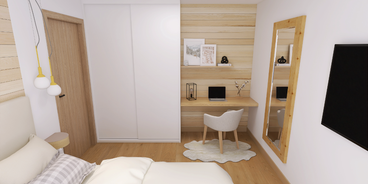 Ma mission ? Concevoir et harmoniser trois espaces distincts — la pièce de vie, la chambre parentale et la chambre des enfants — autour d’une même ligne directrice : l’esprit chalet revisité, où authenticité montagnarde et confort contemporain se rejoignent avec élégance.