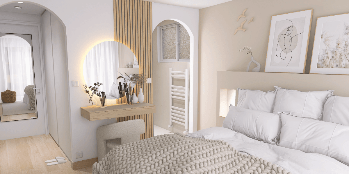L’espace a été entièrement repensé afin d’optimiser chaque volume et de créer une circulation fluide et harmonieuse. Dès l’entrée, un grand dressing structure l’accueil, complété par une salle d’eau discrètement intégrée à proximité. Deux ouvertures en arche viennent adoucir les lignes et apporter du caractère à l’ensemble.