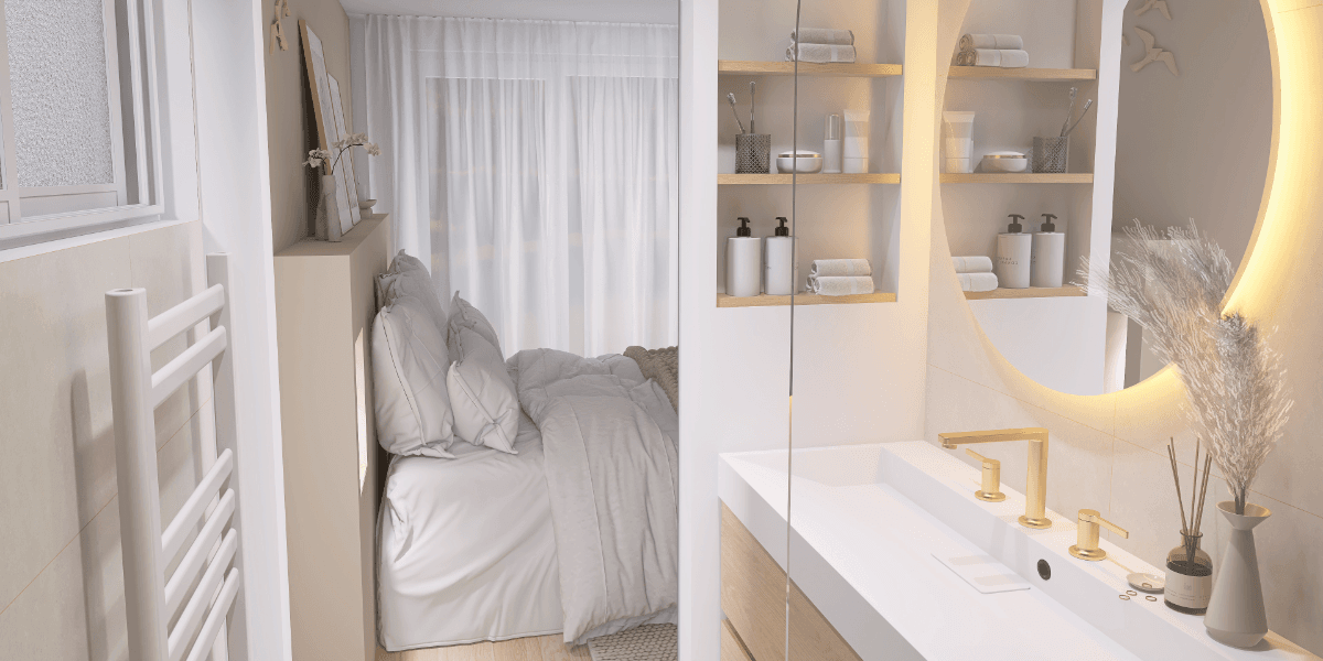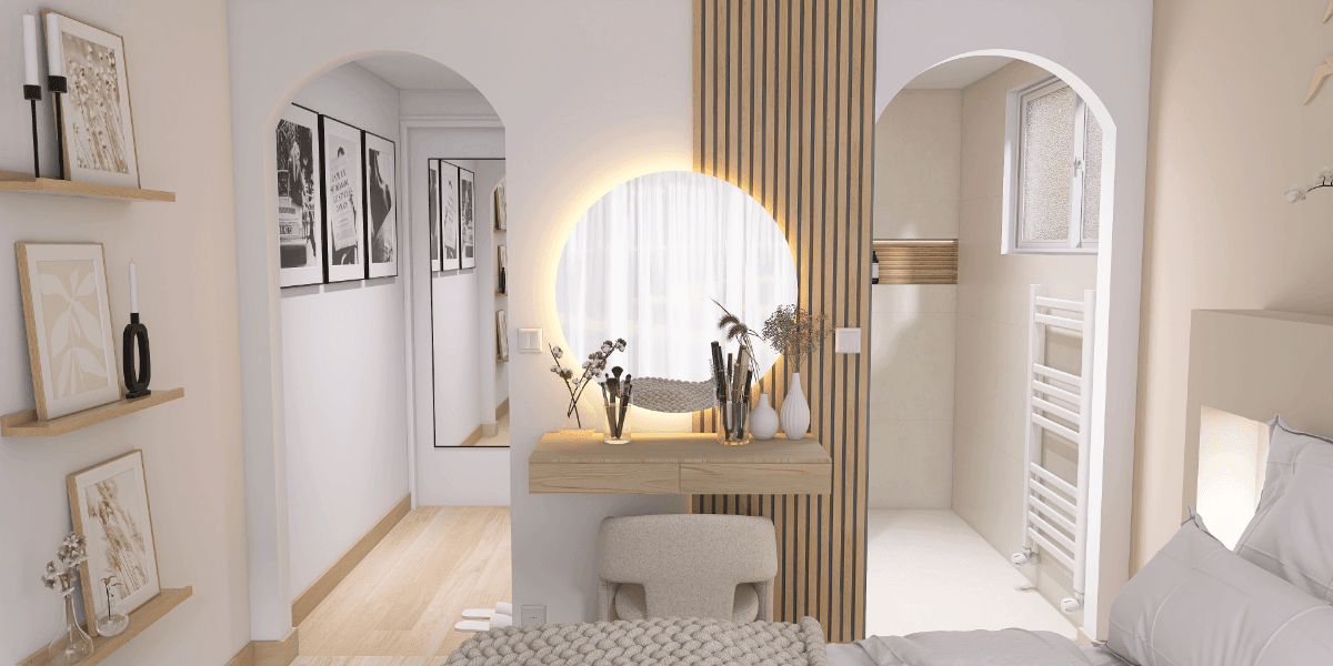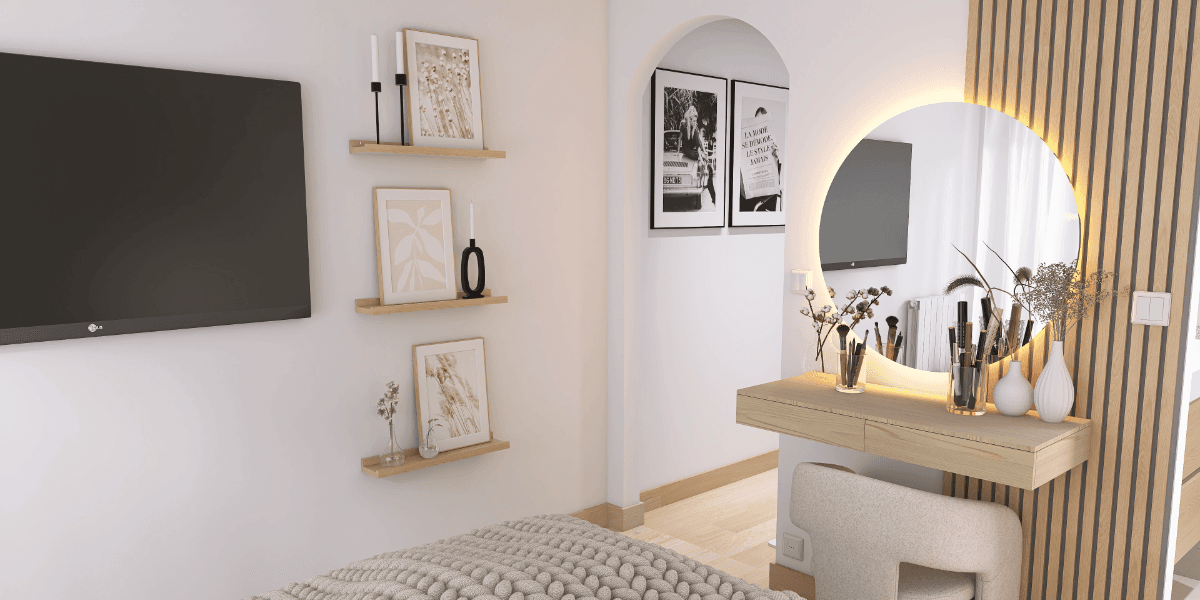 La chambre se distingue par une tête de lit sur mesure, intégrant des niches encastrées sublimées par un éclairage LED, créant une ambiance à la fois douce et contemporaine. Un espace coiffeuse a également été imaginé, habillé de tasseaux de bois et accompagné d’un miroir rond rétroéclairé, apportant chaleur et sophistication.