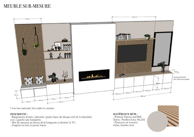 - Un plan d’implantation de la pièce qui reprend les références des peintures, matériaux que nous aurons définis ensemble.